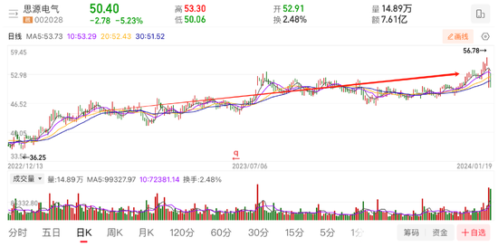 公开资料显示,思源电气的主营业务为输配电设备的研发、生产、销售及服务。2019年底,随着新能源行业的投资热潮,思源电气在二级市场的股价迎来腾飞。截至2023年底,思源电气股价已经从2019年9月末的10.75元上涨至52元,是少有的超级大牛股。