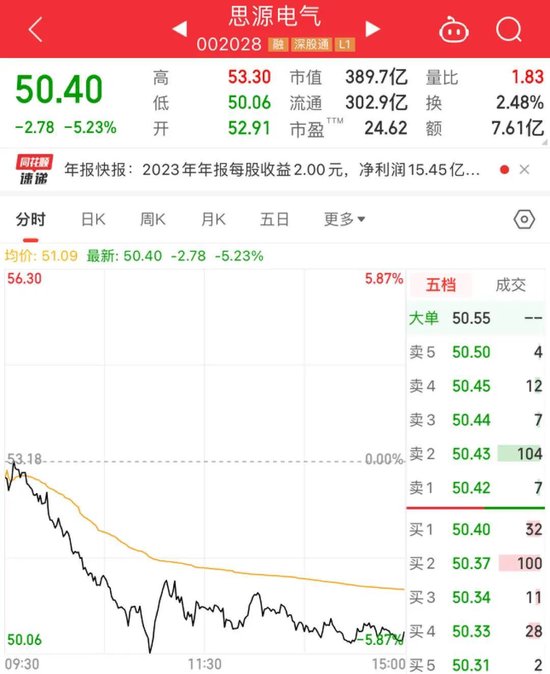 但在1月17日,思源电气公布了2023年年度业绩快报后,股价却在近两个交易日连续下跌,截至19日收盘,思源电气跌幅为5.23%,报50.40元/股。