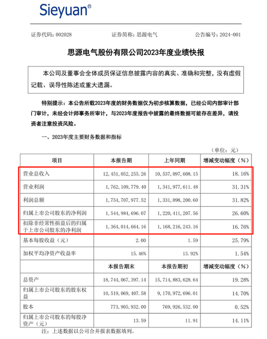 1月17日,思源电气发布2023年年度业绩快报,2023年公司实现营收124.51亿,同比增长18.16%;公司归属于上市公司股东净利润15.45亿,同比增长26.6%。