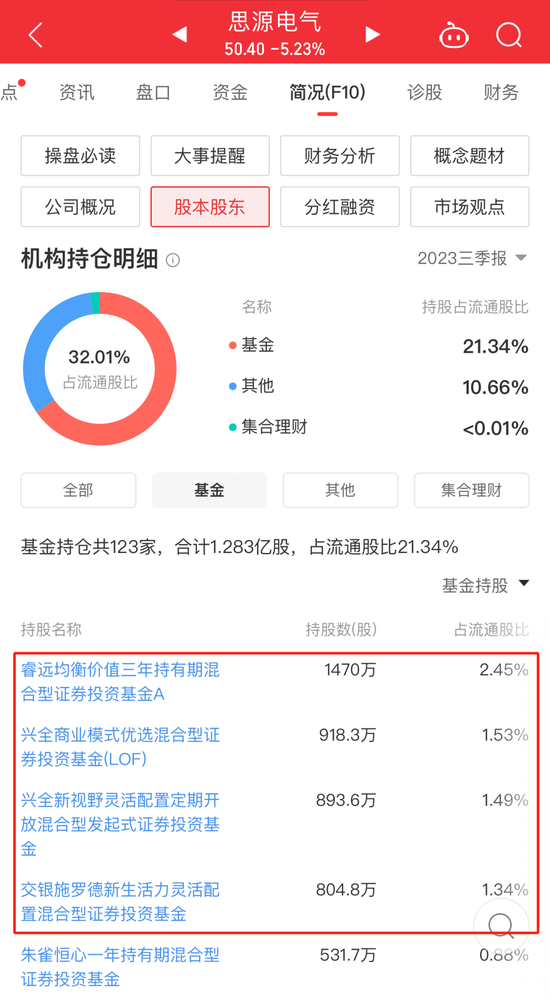 同花顺数据显示,截至2023年第三季度,共有126家机构持仓思源电气,其中基金123家,这次被董秘点名怒怼的睿远、兴全、交银正好是持股前四。