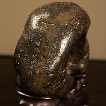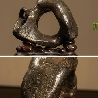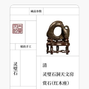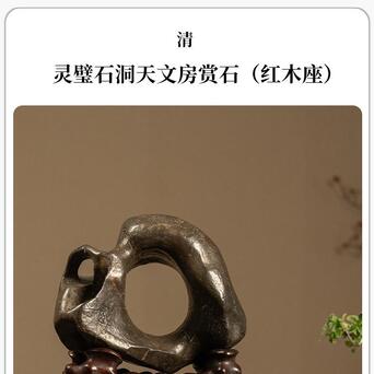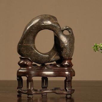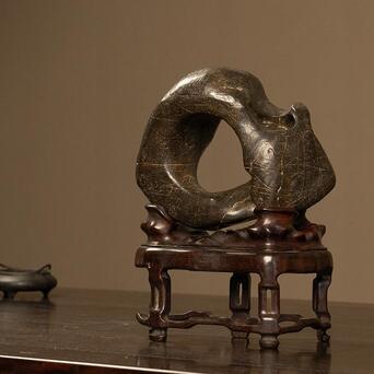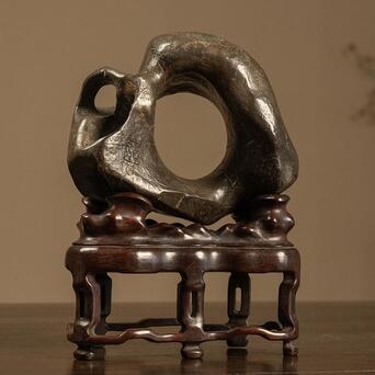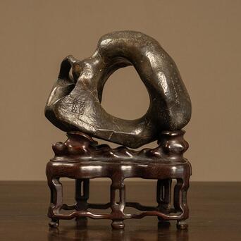 此品赏石体量精巧,形态奇诡,整体大致圆形,中部和侧面生出硕大孔洞,形如洞天满月,通透明快,浑然天成,石表光洁,虽有崎岖之处却不明显,在润泽包浆的掩映下风姿卓越,凸显出敦厚沉稳的气质。一侧阴刻诗文“中又隐孤壁,紫锦藉圆素。山只与地灵,暗巧不欲露”,落款“华亭改琦”。底配高挑红木座,上仿奇石褶皱,下接三弯腿与龟足,更显整体优雅绮韵。